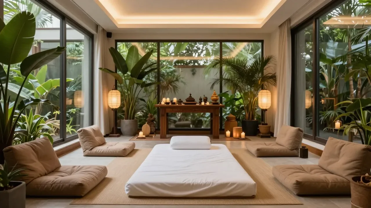 At AscentFive, your 5-MeO-DMT experience unfolds in a sanctuary designed for complete safety and surrender. Plush floor cushions allow you to recline fully supported, while soft ambient lighting and lush greenery create a warm, grounding atmosphere. Every element—from gentle lantern glow to spacious layout—has been crafted to foster deep trust. Our experienced facilitators maintain a protective presence throughout, ensuring you feel held as you explore non-ordinary consciousness.